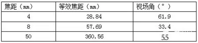 以下列舉幾個(gè)實(shí)例:長(zhǎng)焦距鏡頭視場(chǎng)角窄于40°,例如:鏡頭焦距2.5 mm,視場(chǎng)角為 45°左右。鏡頭焦距5.0 mm,視場(chǎng)角為 23°左右。鏡頭焦距7.5 mm,視場(chǎng)角為 14°左右。鏡頭焦距10 mm,視場(chǎng)角為 12°左右。鏡頭焦距15 mm,視場(chǎng)角為 8°左右。