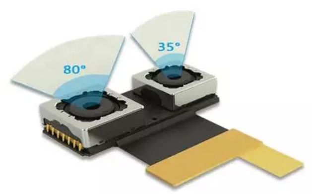 一顆85度廣角鏡頭和一顆35度長(zhǎng)焦鏡頭組成的雙攝像頭模組,可以通過(guò)雙攝模組間的鏡頭進(jìn)行切換,實(shí)現(xiàn)2X以上的光學(xué)變焦功能。