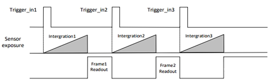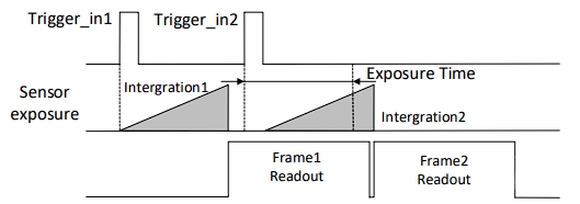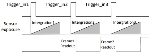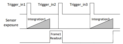 若第2個(gè)觸發(fā)信號第1幀圖像的曝光結(jié)束時(shí)間早于相機(jī)當(dāng)前第1個(gè)觸發(fā)信號最后1幀出圖時(shí)間,則相機(jī)內(nèi)部會(huì)做處理,將第2個(gè)觸發(fā)信號第1幀圖像的曝光開始時(shí)間推遲,確保第2個(gè)觸發(fā)信號第1幀圖像的曝光結(jié)束時(shí)間不早于第1個(gè)觸發(fā)信號最后1幀的出圖時(shí)間。