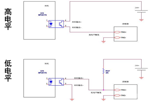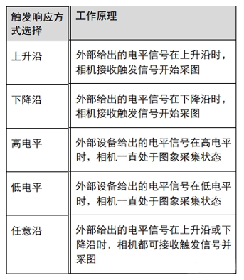 觸發(fā)響應(yīng)方式:相機(jī)可以設(shè)置在外部信號的上升沿、下降沿、高電平或低電平進(jìn)行觸發(fā)采圖。