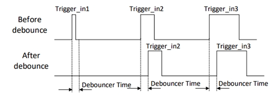 觸發(fā)防抖:外觸發(fā)信號給到相機(jī)時(shí)可能存在毛刺,如果直接進(jìn)入到相機(jī)內(nèi)部可能會(huì)造成誤觸發(fā),此時(shí)可以對觸發(fā)信號進(jìn)行去抖處理。